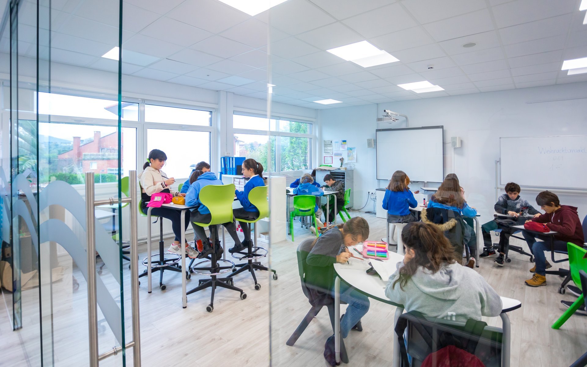 Las aulas tienen paredes de cristal y las dos aulas de cada curso están conectadas por una pared de cristal movible que permite experiencias educativas compartidas para todo el alumnado de un curso. Su diseño es flexible lo que permite diferentes formas de trabajo y cumple con las características fisiológicas, anatómicas y psicológicas en lo que a ergonomía se refiere.